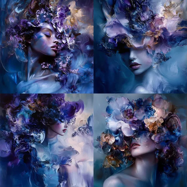 Этот стиль — настоящая симфония живописных текстур и плавных форм. Насыщенный синий и глубокий фиолетовый создают сказочную атмосферу. Выразительные черты и проникновенные взгляды усиливают неземное настроение, напоминая об влиянии импрессионизма и романтизма.