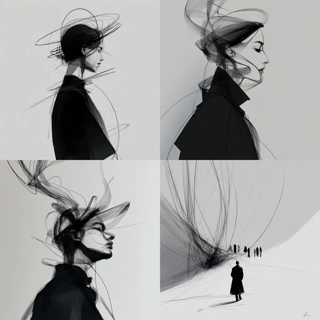 Эфирные линии и призрачные силуэты преобладают, создавая атмосферу сна на разнообразные темы. Монохромная палитра усиливает сюрреалистичность изображений с выразительными контурами и минималистичными деталями. Этот стиль отлично передаёт эмоции с помощью тонких, шепчущих линий, что делает его идеальным для модной иллюстрации, редакционного дизайна и концепт-арта.