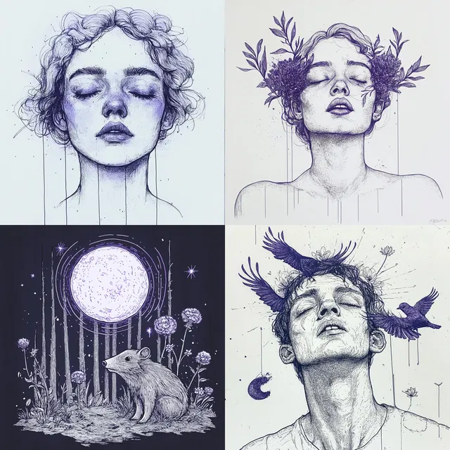 Замысловатые линии и тонкие тени определяют этот стиль, сочетая элегантность ар-нуво с современными темами. Монохромная палитра фиолетовых оттенков усиливает его неземное качество, создавая сказочную атмосферу в разнообразных сюжетах.