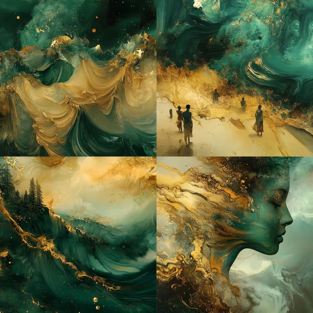 Эфирная текучесть завораживает своими вихревыми движениями и сказочной атмосферой, объединяя динамику жидкости с сюрреалистичной абстракцией. Насыщенные цветовые палитры и золотые блики создают сияющее свечение, а замысловатые детали и органические узоры вызывают ощущение гармоничной композиции.
