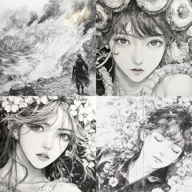 Сложный и изящный рисунок линий и монохромная элегантность определяют этот стиль, в котором переплетаются влияние модерна и динамика современной манги. Детальная штриховка и тонкая перекрёстная штриховка создают богатую текстурную глубину, а выразительные глаза и нежные черты лица придают эмоциональную насыщенность.