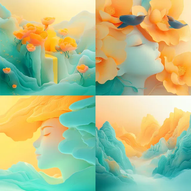 Визуальная симфония пастельных градиентов и органических форм завораживает своей неземной атмосферой и сказочностью. Плавные очертания и плавные переходы создают гармоничное сочетание цвета и формы, вызывая ощущение спокойствия и потусторонности. Использование светлых красок и мягкого фокуса придаёт сияющее свечение, усиливая сюрреалистичность и образность повествования.