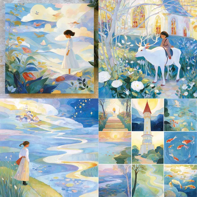 Пастельные тона и мягкие градиенты занимают доминирующее положение, создавая воздушную и причудливую атмосферу в различных темах. Импрессионистические мазки и выразительная манера письма придают картине сказочное качество, а парящие конструкции и небесные мотивы вызывают ощущение фантазии.