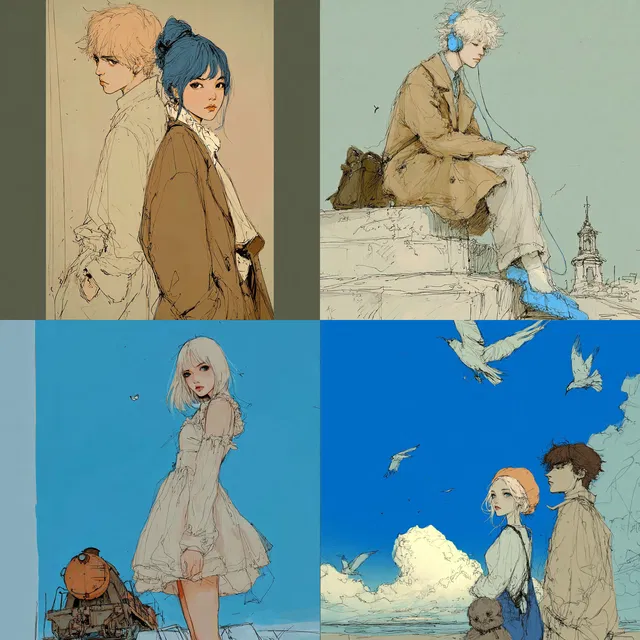 Нежные линии и пастельная палитра определяют этот стиль, создавая сказочную атмосферу с воздушными элементами. Мягкие текстуры и светлые оттенки вызывают чувство ностальгии и причудливости, а выразительные персонажи и динамичные позы усиливают глубину повествования.