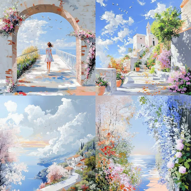В этом стиле преобладают импрессионистические пейзажи, для которых характерны светлые цвета и живописная манера письма. Мягкие пастельные тона и плавные градиенты создают безмятежную, сказочную атмосферу. Стиль прекрасно подходит для изображения спокойных идиллических сцен с акцентом на цветочные и прибрежные мотивы.