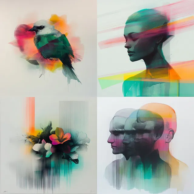Эфирный хроматический синтез очаровывает своей яркой палитрой и абстрактным наложением слоёв, создавая сказочное слияние цвета и формы. Текстурированные наложения и размытые края придают сюрреалистичность, а динамичные формы и плавные очертания вызывают ощущение движения.