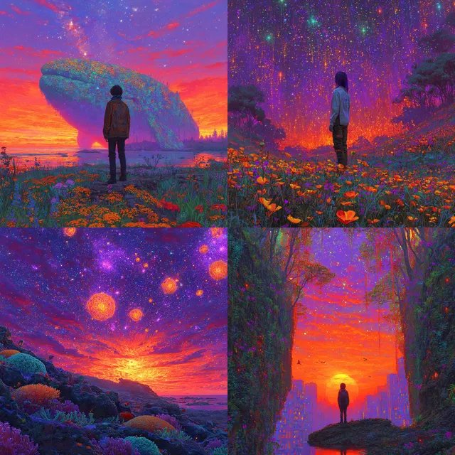 Этот стиль отличается яркими психоделическими и похожими на сон образами. Его характерные черты — это перенасыщенные цвета и светящиеся градиенты, которые создают неземное свечение.