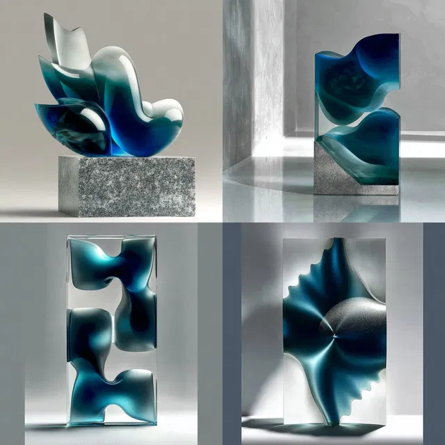 Преобладают полупрозрачные синие оттенки и металлический блеск, которые создают неземную атмосферу вокруг скульптурных форм. Стиль отличается абстрактным выражением, а плавная динамика и отражающие поверхности придают ему сказочное качество. Постоянно присутствует минималистичная эстетика, которая создаёт спокойное и умиротворённое настроение.