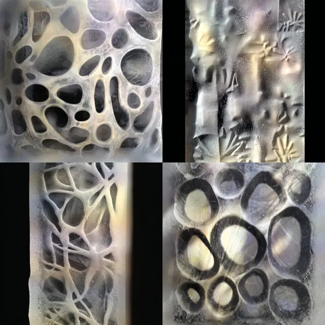 Преобладают текстурированные поверхности, которые создают эфемерную, сказочную атмосферу. Органические формы и плавные очертания вызывают ощущение природной красоты, напоминая сюрреализм и биоморфизм. Мягкие оттенки и нежные тона усиливают мистическое качество, а грубые текстуры добавляют глубины и интриги.