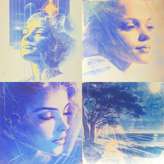 В этом стиле преобладают призрачно-синие оттенки. Плавно сочетаются набросочные линии и футуристические темы. Композиции часто включают сложные перекрёстные штриховки и травление, создавая ощущение глубины и текстуры. Архитектурные и геометрические элементы напоминают о ретрофутуристике и влиянии ар-деко, вызывая ощущение модернизма и научно-фантастических исследований.