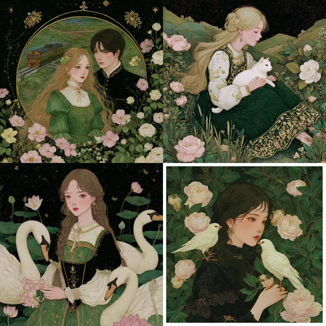 Этот стиль отличает сложная детализация и неземная красота с сильным акцентом на романтическую и причудливую эстетику. Использование природных оттенков зелёного, мягких пастельных тонов и золотых акцентов создаёт сказочную атмосферу. Замысловатые линии и нежные текстуры добавляют глубину и богатство.