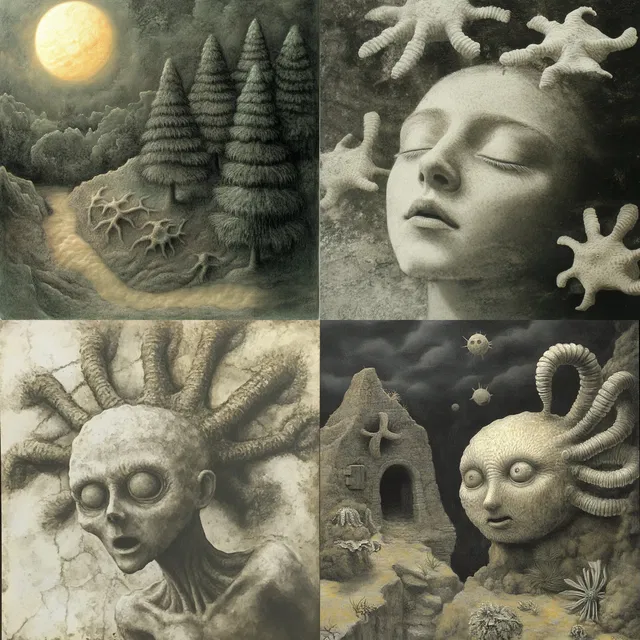 Сюрреализм встречается с органическими текстурами в сказочном визуальном повествовании. Этот стиль отличается созданием неземной атмосферы с помощью фактурных поверхностей и землистых тонов, что придаёт работам мистическое и потустороннее качество. Органические формы и природные мотивы пронизывают композиции, создавая уникальное сочетание сюрреалистических пейзажей и фантазийных тем.