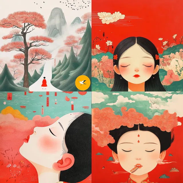 Восточные эстетические мотивы привлекают внимание своей техникой плоской иллюстрации и стилизованными формами, напоминающими традиционные японские искусства. Яркие цвета и резкие контрасты создают поразительный визуальный эффект, а интеграция культурных тем и мифологических элементов добавляет глубины.