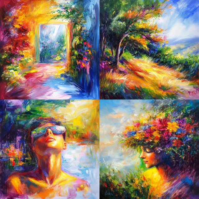 Выразительная манера письма и яркие цвета занимают доминирующее положение, создавая динамичное и живое визуальное впечатление. Стиль отличается умением передать энергичность с помощью живописных мазков и смелых оттенков, что напоминает влияние импрессионизма и фовизма. Преобладают органические формы и плавные композиции, гармонично сочетающие природу и абстракцию.