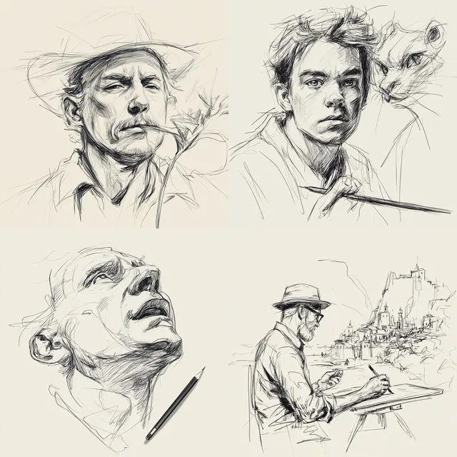 В работах преобладают выразительные линии и динамичные наброски, создающие плавные композиции и спонтанные рисунки. Стиль отлично подходит для изображения фигур людей и городских пейзажей, передавая ощущение скетча и напоминая о классическом рисовании.