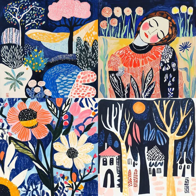 В нём создаются живые композиции с плоскими текстурами и упрощёнными формами. Часто используются игривые мотивы и замысловатые узоры.