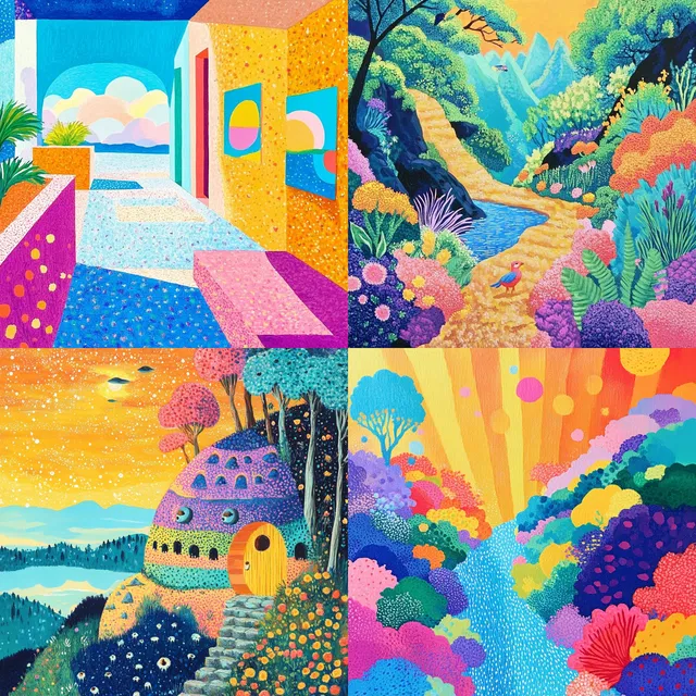Этот стиль прекрасно подходит для передачи ярких пейзажей, игривых персонажей и причудливых сюжетов, что делает его идеальным для иллюстраций детских книг и декоративного дизайна. Однако его буйство красок может затмить более тонкие темы, ограничивая применение в более сдержанных контекстах.