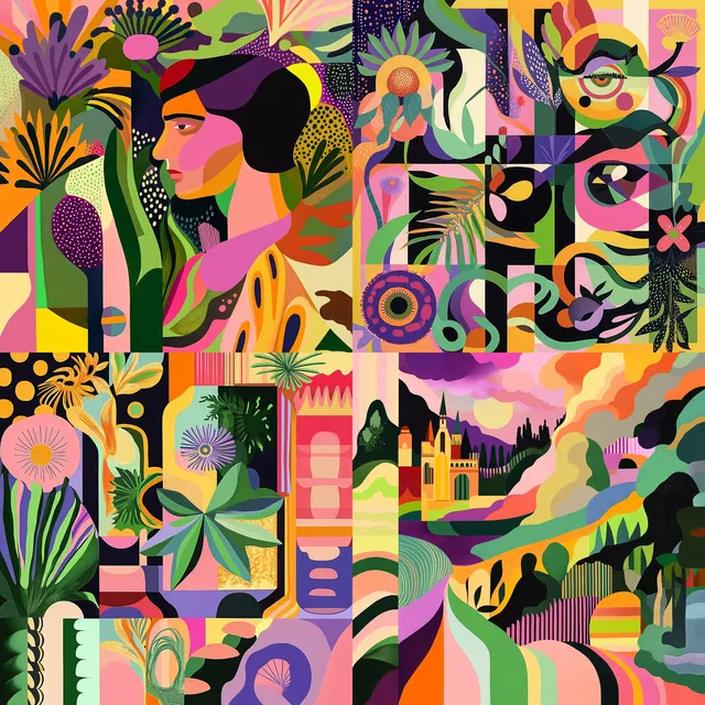 Яркие цветовые блоки и динамичные композиции определяют этот стиль, вдохновлённый фовизмом и орфизмом. Насыщенные цвета и выразительные палитры создают живую, игривую атмосферу. Многослойные композиции и переплетённые элементы добавляют глубину и сложность.