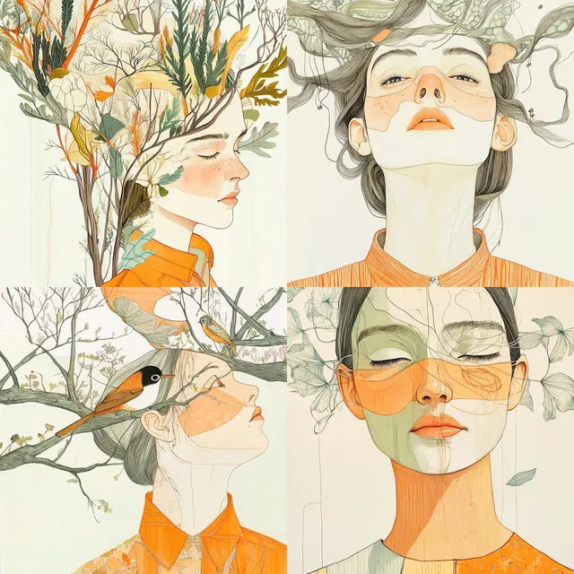Эфирные ботанические нарративы сочетают замысловатые линии с мягкой цветовой палитрой, создавая гармоничное слияние природы и человеческих форм. В стиле явно прослеживается влияние искусства модерн, для которого характерны плавные мазки кисти и нежные наброски.
