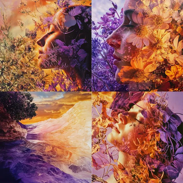 Эфирная фузия завораживает мастерским использованием техники двойной экспозиции, объединяя человеческие фигуры с ботаническими и городскими элементами в сюрреалистичной, похожей на сон манере. Замысловатые композиции и яркая цветовая палитра создают гармоничный баланс между природой и технологиями.