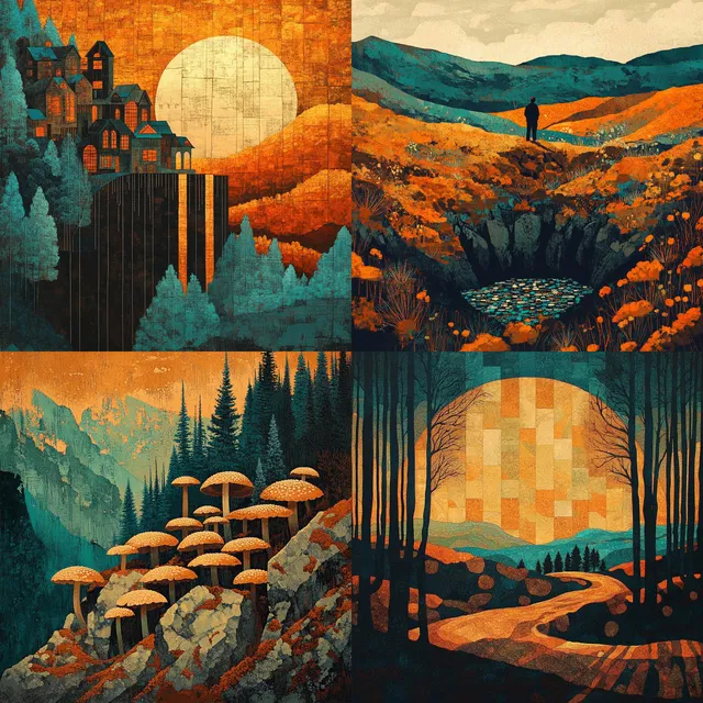 Он превосходно подходит для создания атмосферных пейзажей и замысловатых узоров. Вдохновение для него черпают в искусстве ар-нуво и символизме. Геометрическая точность и выразительность стиля проявляются в разных темах — от футуристических городских пейзажей до ретропанк-персонажей.