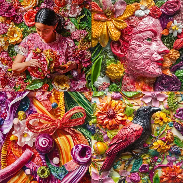 Динамичные композиции и смелые контрасты создают оживлённую и праздничную атмосферу, напоминая художественные традиции Мексики и Латинской Америки.
