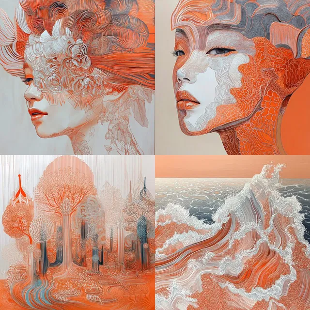 Эфирный поток завораживает своей сложной детализацией и плавными линиями, вызывая ощущение движения и текучести. В этом стиле используется монохромная палитра, в которой преобладают мягкие оттенки оранжевого и белого. Она создаёт сказочную атмосферу, одновременно эфемерную и приземлённую. Широко применяются мотивы, вдохновлённые природой, и органические узоры, которые органично сочетаются с городскими и абстрактными формами.