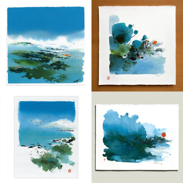 В этом стиле преобладают свободные мазки кисти и яркая синяя палитра, которые создают спокойную и умиротворяющую атмосферу. Композиции часто включают парящие элементы и естественные композиции, что придаёт им изящество и элегантность. Видно влияние японского искусства, а также отсылки к импрессионизму и абстрактному экспрессионизму.
