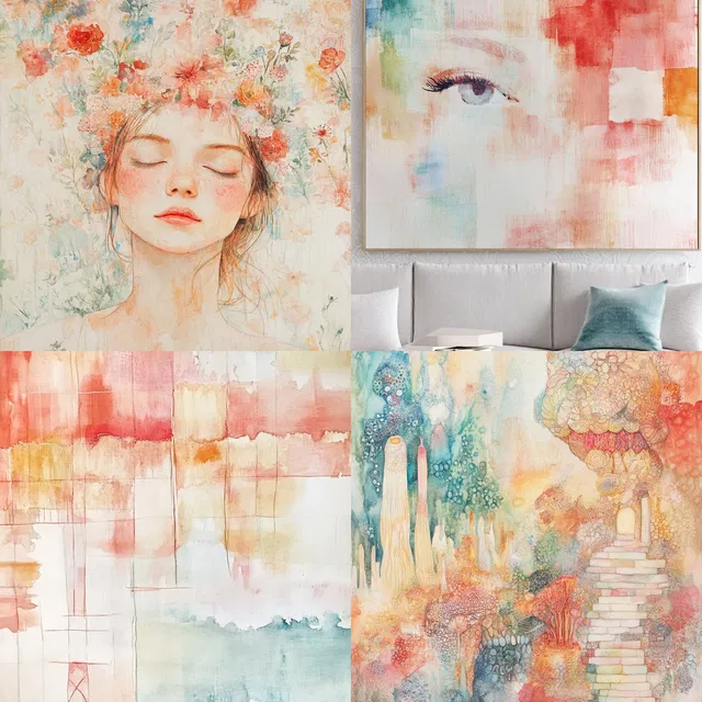 Эфирные акварельные сновидения вызывают ощущение спокойствия и причудливости благодаря текучим заливкам и мягкому смешиванию. Нежные мазки и пастельная палитра создают образную сущность, напоминающую влияние импрессионизма. В композициях преобладают органические формы и гармоничные изгибы, что придаёт им мечтательное качество, одновременно спокойное и чарующее.
