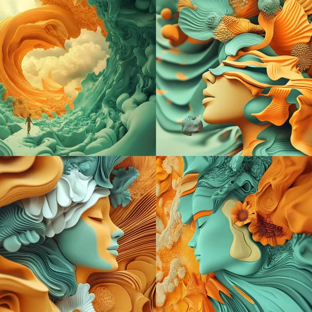 «Fluid Dreamscapes» завораживает своей гармоничной смесью сюрреализма и биоморфных форм, создавая яркие и сказочные визуальные впечатления. В этом стиле используются плавные, органические формы и гармоничная цветовая палитра, чтобы вызвать чувство фантазии и воображения.