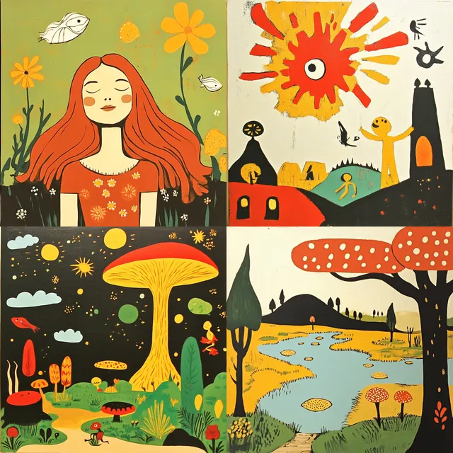Яркий и игривый стиль, который передаёт суть наивного искусства благодаря смелому использованию основных цветов и упрощённых форм. Композиции отличаются плоской перспективой и графическими контурами, что создаёт детскую непосредственность, которая находит отклик в различных темах. В этом стиле явно прослеживаются восточноевропейские и славянские влияния, которые проявляются в народных мотивах и придают визуальным образам этническую насыщенность.