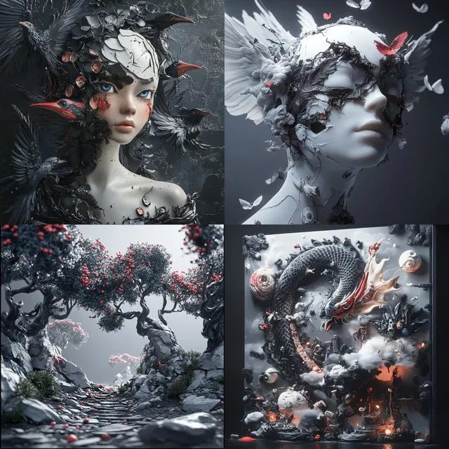 Этот стиль отличается сложностью и замысловатостью. Он прекрасно подходит для создания детальных, фактурных изображений, которые одновременно обладают скульптурностью и объёмом. Он процветает в динамичных, энергичных композициях, часто обращаясь к мифическим и легендарным темам с сюрреалистичной, сказочной атмосферой.