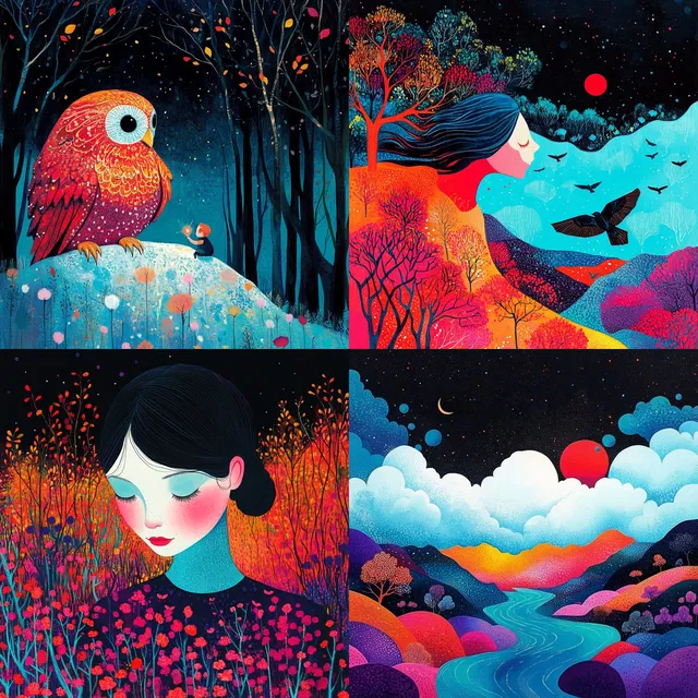 Яркие цвета и причудливые дизайны преобладают, создавая сказочную атмосферу на различные темы. Замысловатые детали и многослойные композиции усиливают сюрреалистичность, а игривые мотивы и яркие оттенки вызывают ощущение волшебства. Этот стиль превосходно подходит для фэнтези и сюрреализма, может быть использован в книжной иллюстрации и редакционном дизайне. Однако в фотореалистичных контекстах ему может не хватать реалистичности, поскольку основное внимание уделяется яркому, творческому повествованию.