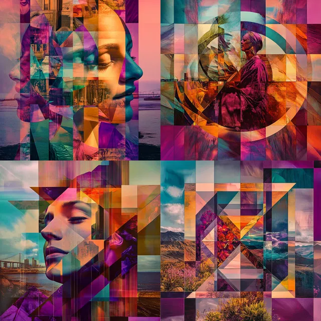 Этот стиль — яркое исследование кубистической абстракции. Он использует геометрические наслоения и фрагментарную композицию для создания динамичных визуальных историй. Применение ярких, призматических цветов усиливает эффект калейдоскопа, а перекрывающиеся формы и переплетённые образы вызывают ощущение современной абстракции.