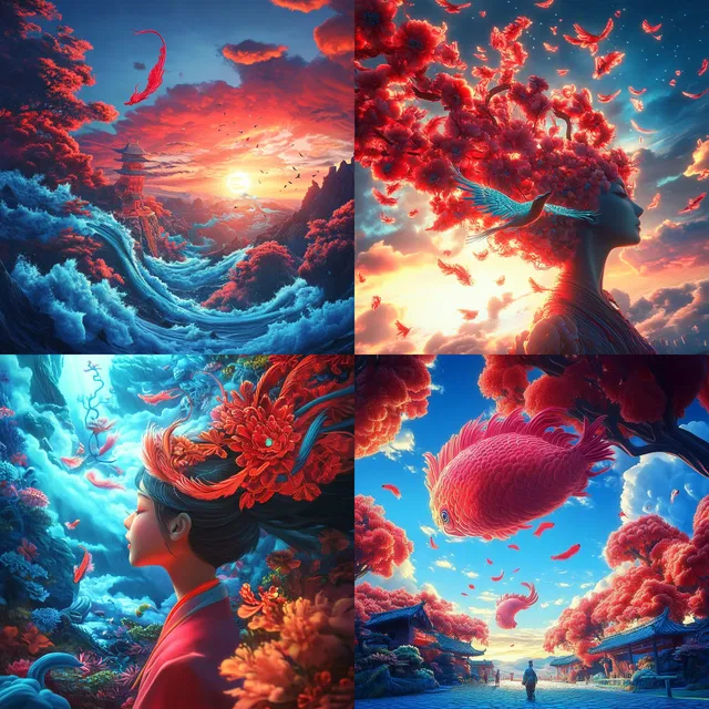 Доминируют яркие цветовые палитры и динамичные композиции, которые создают сказочную, сюрреалистичную атмосферу. Замысловатые детали и выразительные формы пробуждают ощущение фантазии и мифологии, сочетая влияние восточного искусства с современным сюрреализмом.