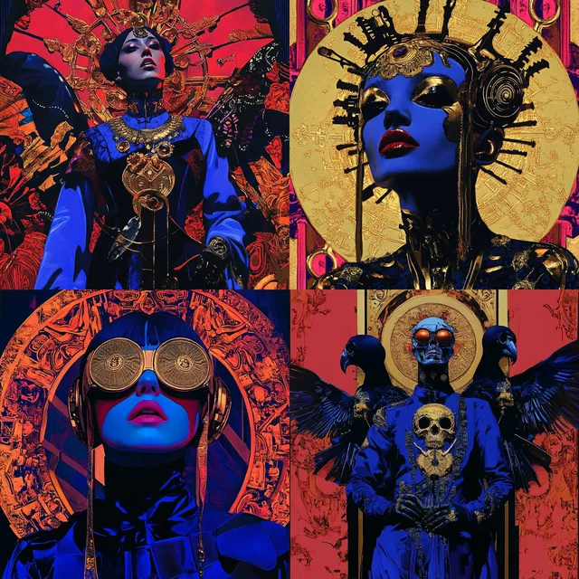 Роскошный неофутуристический миф завораживает своими замысловатыми деталями и яркой цветовой палитрой. В этом стиле сочетаются влияние барокко и эстетика киберпанка. Он отличается созданием многослойных композиций и витиеватых узоров, часто изображая мифических персонажей и футуристическую архитектуру. Насыщенные контрасты и драматическое освещение усиливают сюрреалистичную атмосферу. Однако в фотореалистичных контекстах этому стилю иногда не хватает тонкости.