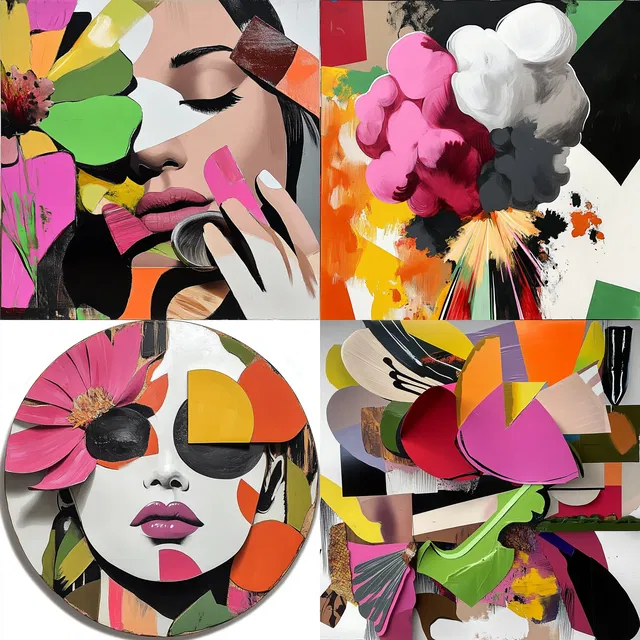 Яркий абстрактный коллаж завораживает своей взрывной палитрой и динамичными композициями. В основе стиля — смелые контрасты и геометрическая абстракция, которые создают визуально выразительный рассказ на самые разные темы.