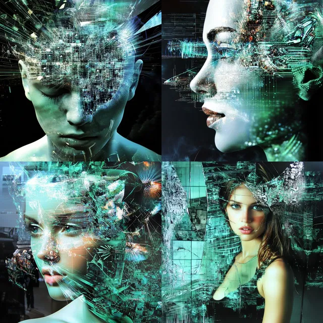 В этом стиле преобладают сложные цифровые композиции, в которых сочетаются фотореалистичные и абстрактные элементы. Использование ярких оттенков бирюзового и сине-зелёного создаёт поразительный контраст, подчёркивая футуристические и технологические темы.