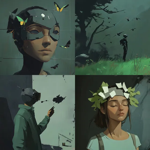 В этом стиле преобладает приглушённая, землистая цветовая палитра, которая вызывает чувство мрачного самоанализа и футуристической меланхолии. Живописные текстуры и многослойные композиции создают глубину и сложность, а органические формы и плавные линии придают изображению сказочное качество.