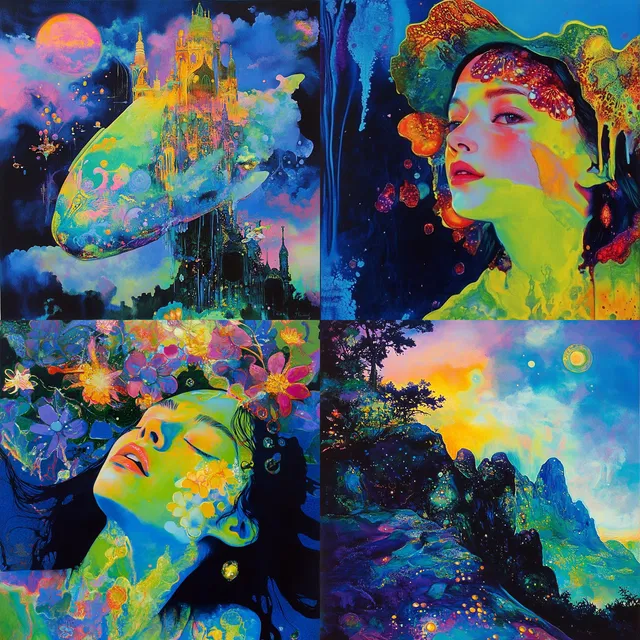 В этом стиле преобладают яркие цвета и высокая контрастность, которые создают сказочную и сюрреалистичную атмосферу. Плавные формы и органические очертания искусно наложены друг на друга, вызывая ощущение причудливости и волшебства. Люминесцентные качества и сияющая цветовая палитра этого стиля напоминают психоделическое и неоновое искусство, вызывая ассоциации с такими художниками, как Яёи Кусама и Ван Гог.