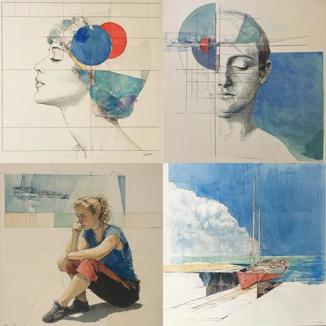 В визуальном языке доминируют геометрическая абстракция и линейная точность, создавая гармоничное сочетание цвета и структуры. Мягкие оттенки синего и приглушённые красные цвета образуют тонкую, но яркую палитру, подчёркивающую минималистичную эстетику.