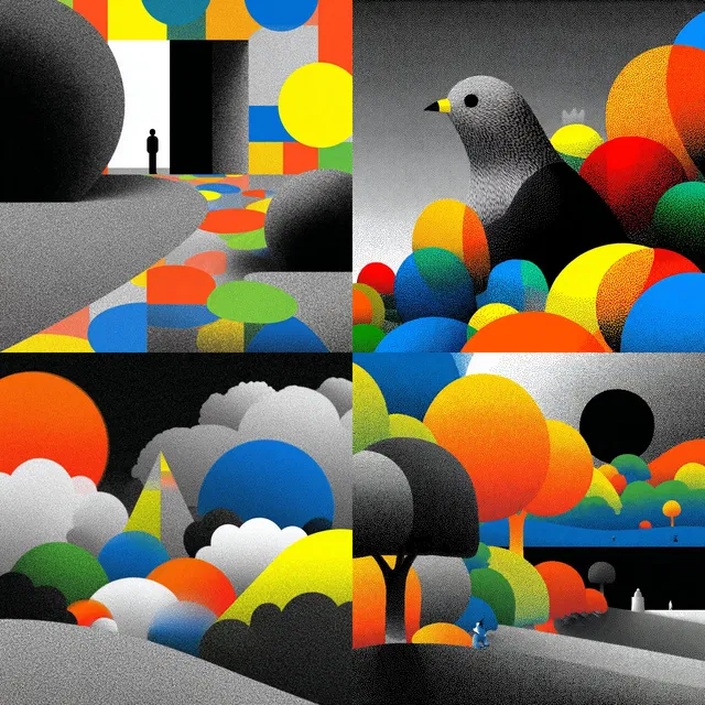 В этом стиле преобладает геометрическая абстракция и смелые контрасты. Основные цвета игриво сочетаются с монохромными фонами. Композиции динамичны, а упрощённые формы и полутоновые текстуры создают ощущение модернистской причудливости.
