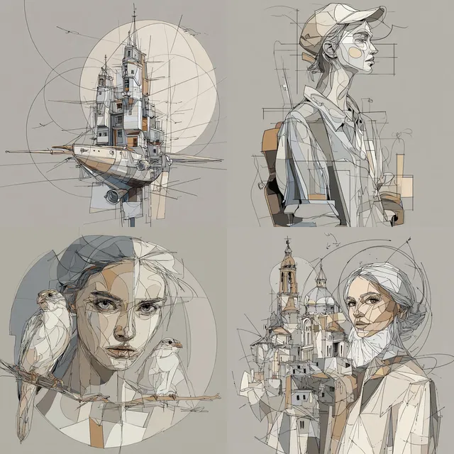 Используется нейтральная палитра с приглушёнными оттенками, подчёркивающая линейную элегантность и структурную сложность. Композиции отличаются многослойной глубиной и пространственной сложностью, часто изображают архитектурные формы, стилизованные фигуры и геометрические пейзажи.