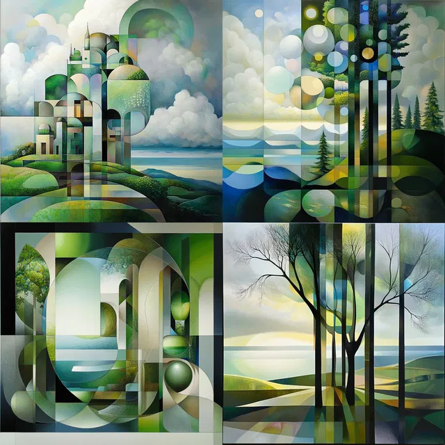 Геометрические сновидения сочетают в себе гармоничное сочетание кубистической абстракции и модернистской элегантности. В этом стиле используются многослойные и взаимосвязанные геометрические формы, чтобы создать фрагментарное, но цельное визуальное повествование. Приглушённые цвета и мягкие градиенты придают изображению эфемерность, а едва заметные блики и лёгкие тени добавляют глубину.
