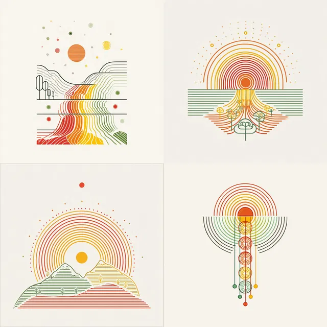 Этот стиль отличается линейной чёткостью и геометрической простотой. Он идеально подходит для создания минималистичных композиций в ретро-цветовой палитре. В нём подчёркиваются чистые линии и структурированные формы, часто вдохновлённые модернистскими течениями и идеями Баухауса.