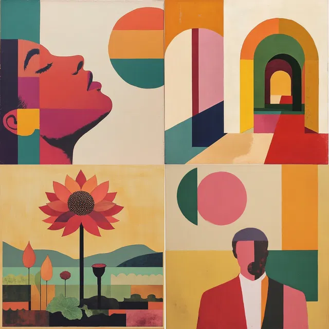 Геометрический модернизм очаровывает своей яркой палитрой и плоскими цветами, используя чёткие линии и сбалансированные композиции. В основе стиля — геометрическая абстракция, вдохновлённая Баухаусом и модернизмом середины века. Это создаёт структурированный макет с гармоничным балансом.