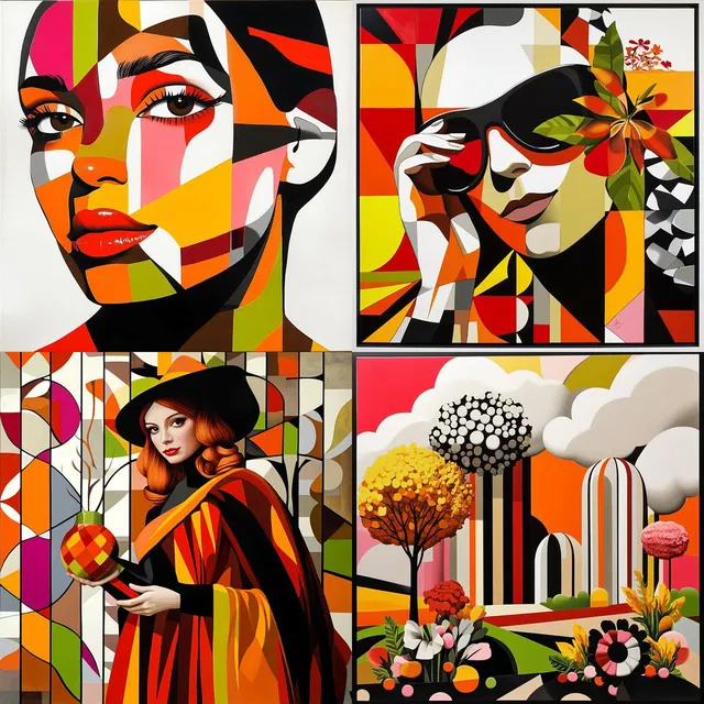 Этот стиль характеризуется яркой геометрической абстракцией, смелыми цветовыми блоками и динамичными композициями. Взаимодействие живых оттенков и модульных схем создаёт игривую, но структурированную эстетику, напоминающую кубизм и поп-арт.