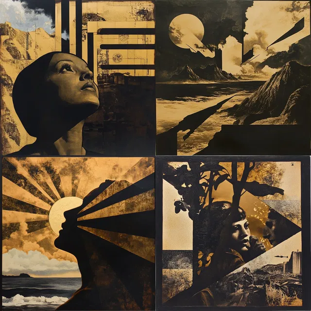 Этот стиль отличается геометрической абстракцией и винтажной эстетикой. Он прекрасно подходит для создания многослойных композиций с высоким контрастом и фактурными поверхностями. Использование тонов сепии и игры теней создаёт ностальгическую атмосферу, напоминающую об арт-деко и конструктивизме.