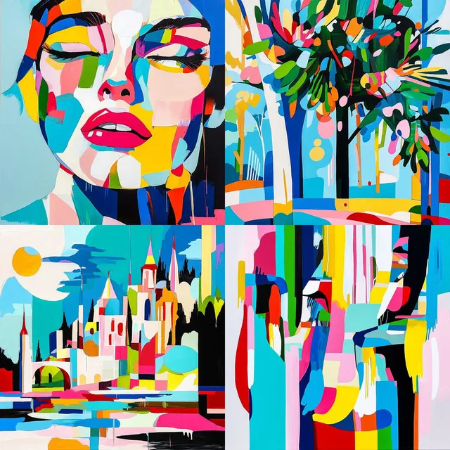 Высокая контрастность и яркая палитра заряжают зрителя энергией, но абстрактная природа стиля может ограничивать его применение в фотореалистичных или детализированных повествовательных контекстах.