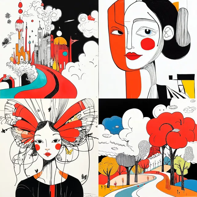 Этот стиль прекрасно подходит для редакционного дизайна, модного брендинга и иллюстраций в детских книгах, предлагая причудливую, но утончённую эстетику. Однако из-за своей абстрактности он может быть не так эффективен в фотореалистичных контекстах или детальных технических схемах. Его сильная сторона — способность передавать энергию и креативность через минималистичные, но выразительные визуальные образы.